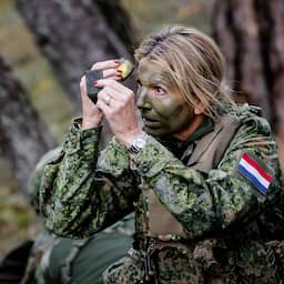 Koningin Máxima heeft dinsdag meegedaan met een training op het opleidingscentrum van de Koninklijke Marechaussee. Dat deed ze met volle overgave, inclusief de camouflerende schmink op het gezicht.
